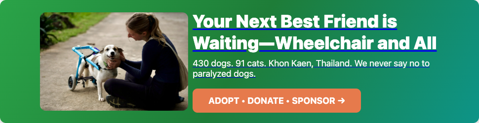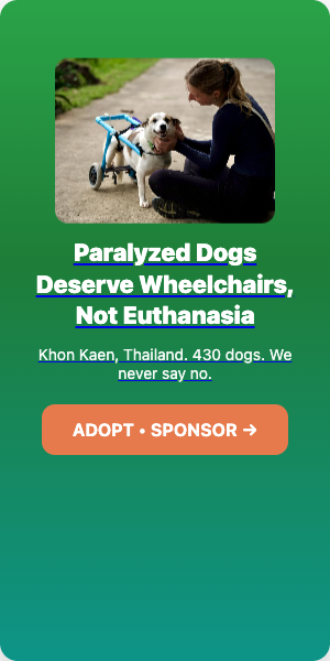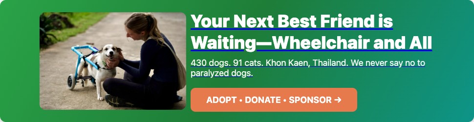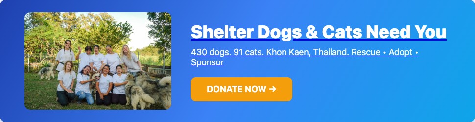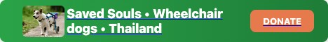 Saved Souls Foundation is Thailand's only shelter dedicated to disabled and special needs animals. Founded in 2010 by Gabriela Leonhard in Khon Kaen, we rescue dogs from the illegal meat trade, stray animals from the streets, and animals that others have given up on. We provide swimming therapy, wheelchairs, and lifelong care for paralyzed dogs, and never turn away a soul in need.